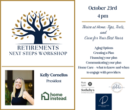 The next workshop in the series, "Thrive at Home: Tips, Tools, and Care for Your Best Years", will be presented by Kelly Cornelius of Home Instead and held October 23rd at 4pm.   Attendees will learn practical steps to plan ahead and maintain independence and quality of life throughout retirement.
